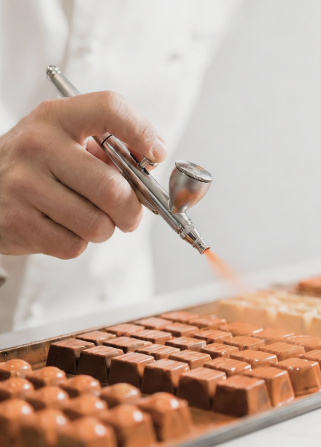 Precision food-grade atomization for delicate decorating, chocolate spraying, and creative plating.