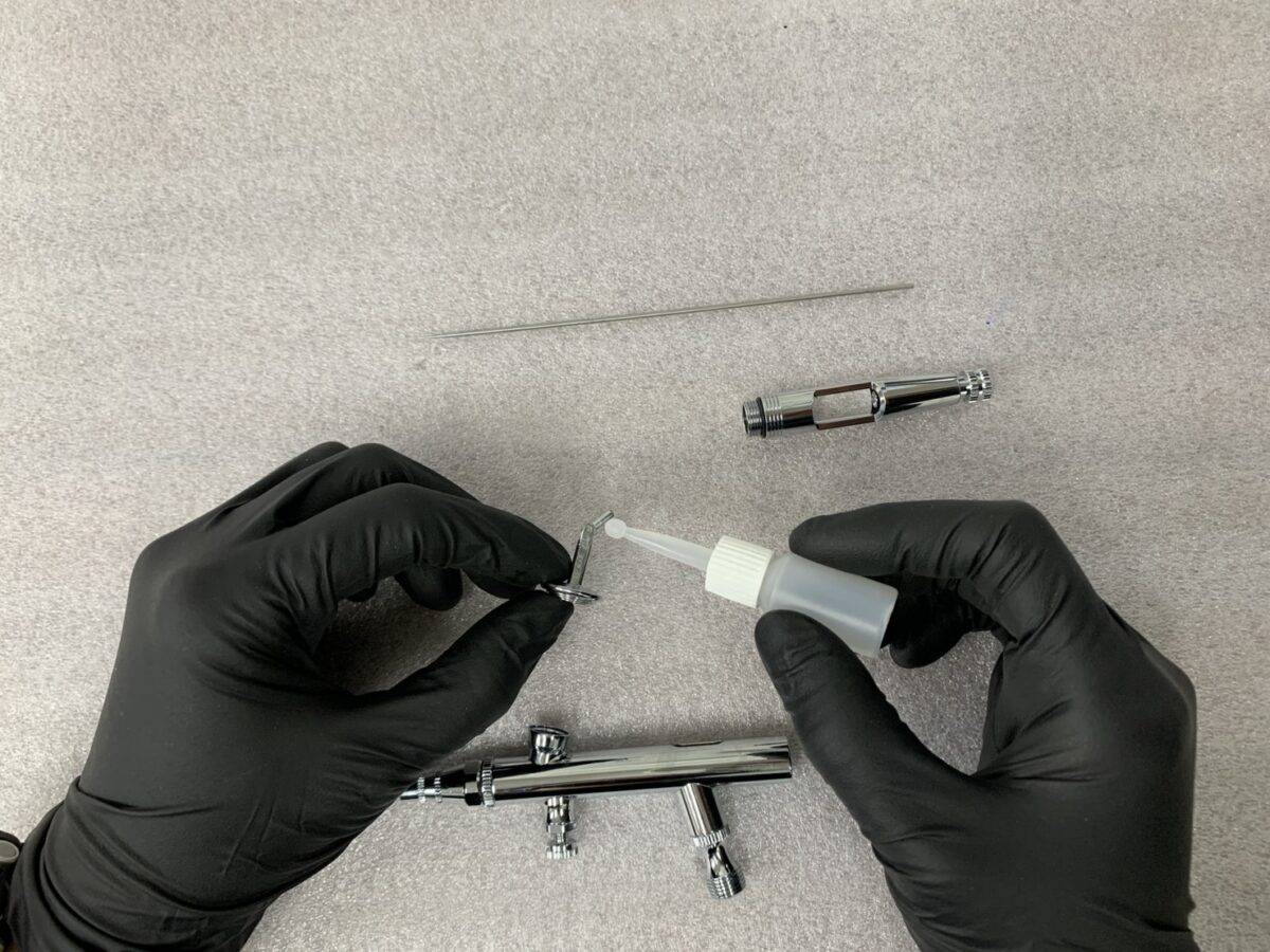 Apply a thin layer of airbrush oil near the shaft seal.